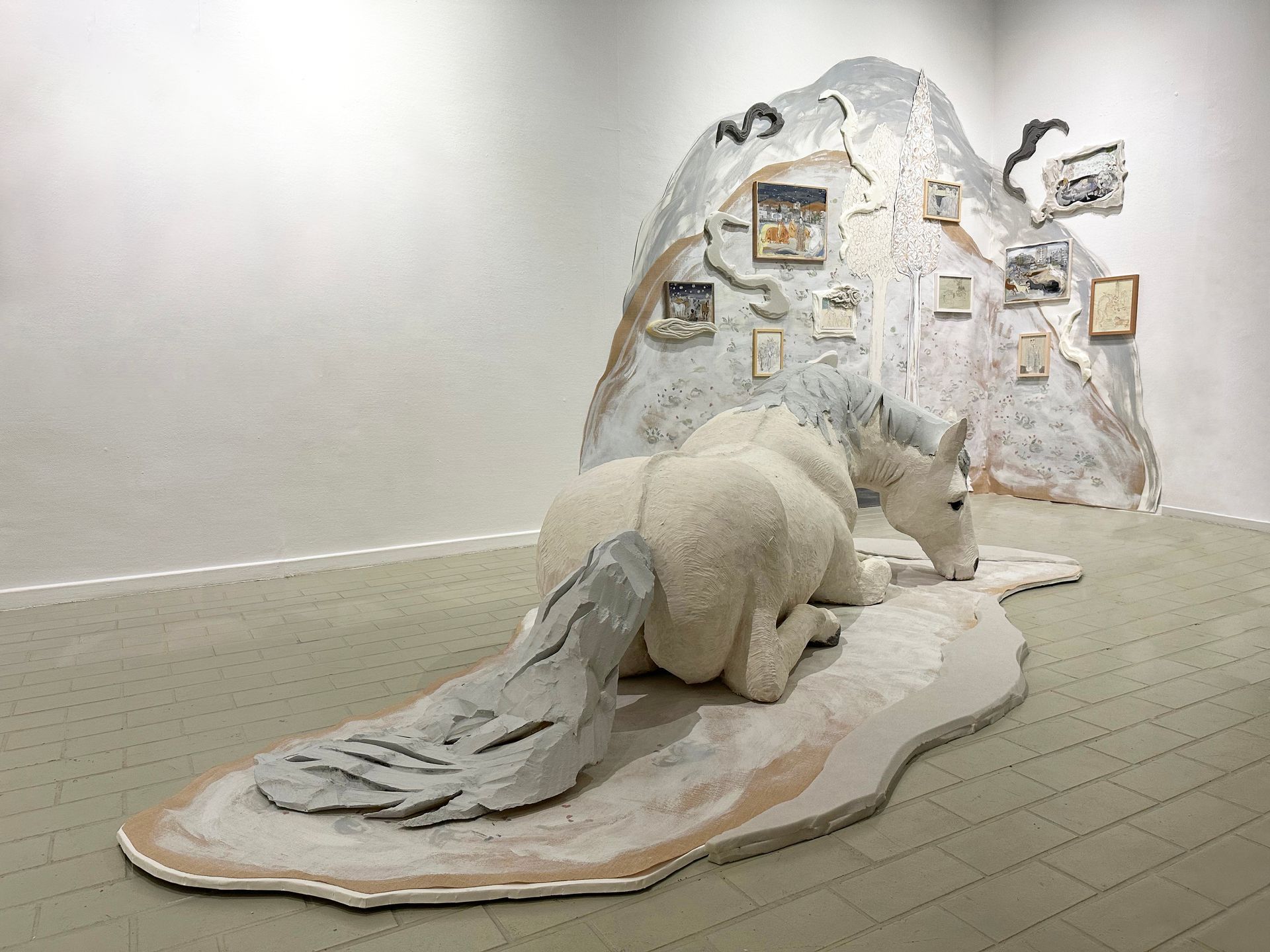 Wandinstallation: 265 x 290 cm (linke Wand) and 235 x 110 cm (rechte Wand)